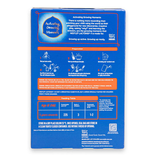 Introducing Lactokid 4, a deliciously creamy drink designed for children from age three. This 400g serving pairs a smooth, kid-friendly flavor with Activ-Grow to support growing bodies during everyday adventures. Easy to sip, fun to drink, and crafted for busy families who want a nourishing beverage that kids actually look forward to with breakfast, after-school breaks, or bedtime routines.
