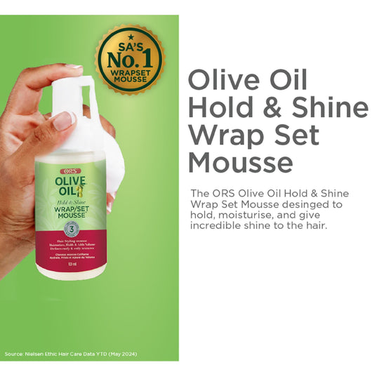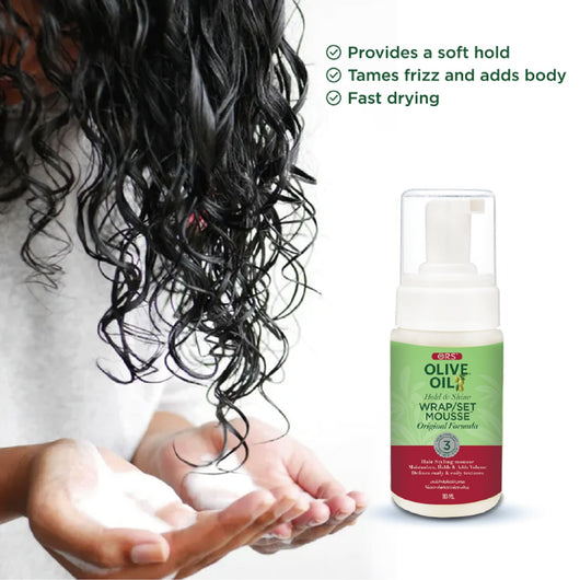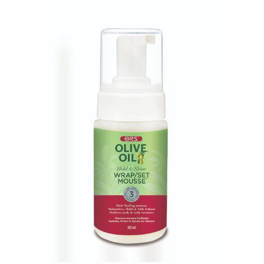 Keywords: Olive Oil Hair Mousse, ORS, Wrap/Set Styling, Hold and Shine, Protective Styles, Frizz Control, Lightweight Foam, 100ml, Hair Care, Versatile Styling